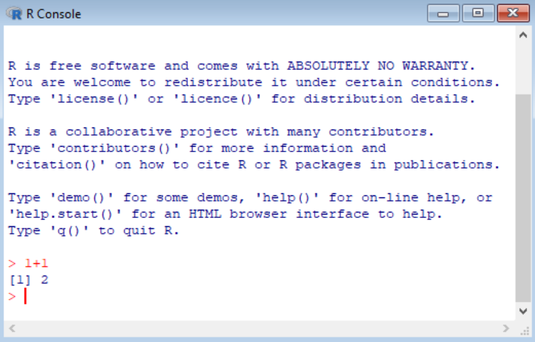 To get started, first, we will open R or RStudio. In R, go to the console, and in RStudio, head to the console pane. Next, type in a basic arithmetic calculation such as “1 + 1” after the angle bracket (>) and hit “Enter.”